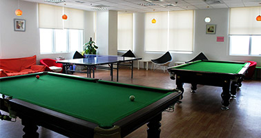 休閑中心公司在辦公區(qū)域設(shè)立了員工休閑中心,休閑中心內(nèi)有臺(tái)球桌、乒乓球桌、桌上足球等一系列玩樂設(shè)施,滿足了大家在午休和下班時(shí)間的休閑放松。